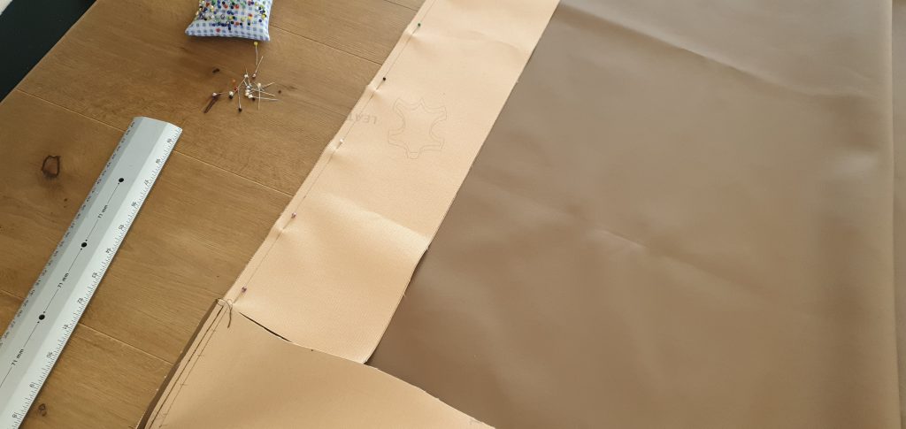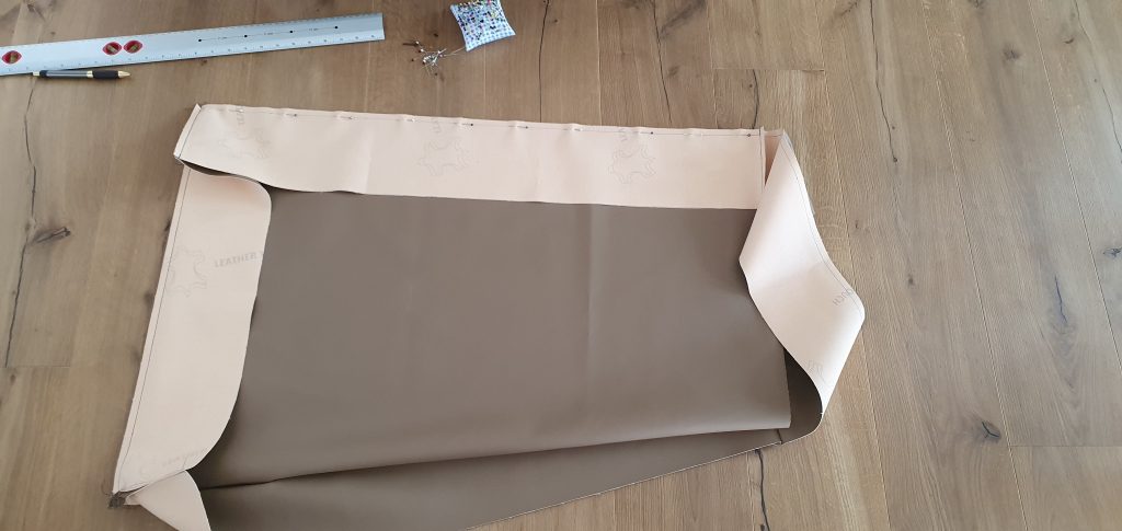 Damit der Bezug perfekt passt, habe ich pro Seite 1 cm Nahtzugabe zum Stoffmaß hinzugefügt. Dadurch ergab sich eine obere Fläche von 61 x 91 cm, die ich auf den Stoff übertrug. Ich entschied mich für Kunstleder in einem warmen Hellbraun (Kunstleder Möbel Textil Meterware Polster Stoff PU SOFT (Capuccino))*