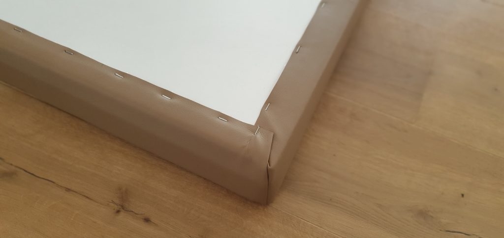 Zum Schluss wird der überstehende Stoff an der Unterseite des Bretts mit einem Tacker fixiert. Die Ecken schlägst du dabei sauber ein. Diese Schritte wiederholst du für die beiden äußeren Abdeckungen.