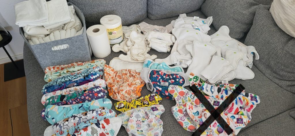 Als unser drittes Kind zur Welt kam, war unsere komplette Stoffwindelausrüstung (siehe Bild) bereits verkauft. Es war einfach nicht mehr machbar. So sehr wir das System auch schätzen – mit drei kleinen Kindern ist die Wäschelogistik schon Herausforderung genug. Die Vorstellung, zusätzlich noch Windeln zu waschen, war für uns schlicht nicht mehr realistisch. Und ganz ehrlich: Man darf sich auch eingestehen, wenn man an seine Grenzen kommt.