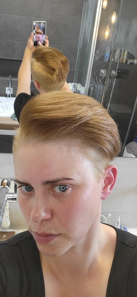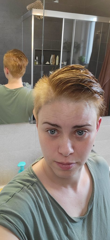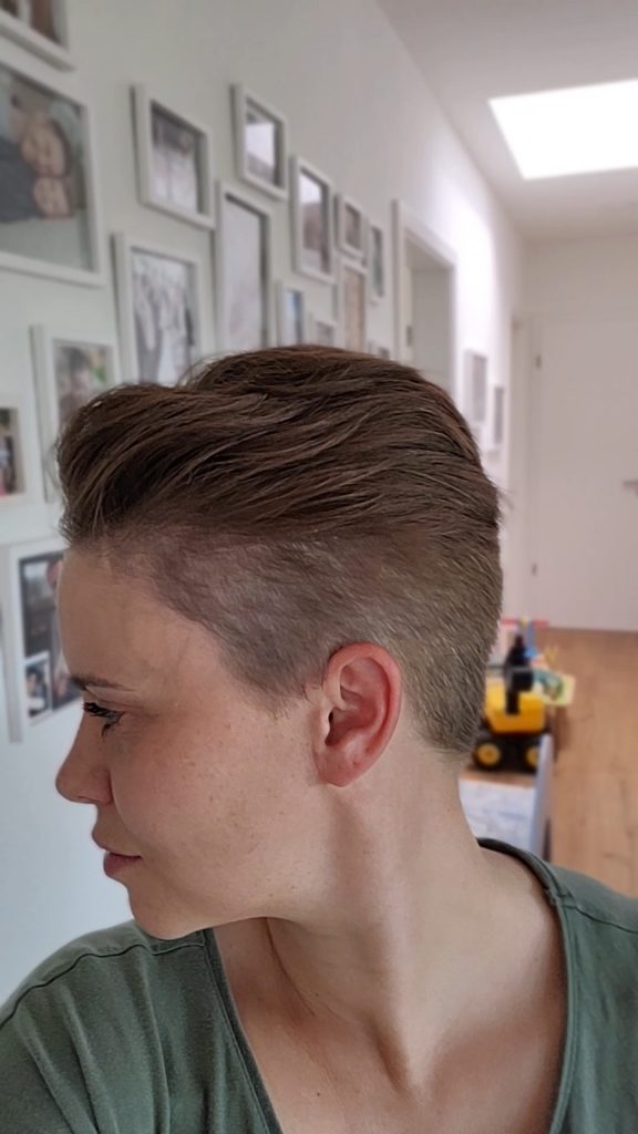 Aber weil’s ja noch nicht reicht, wenn man die Farbe selbst versemmelt, dachte ich mir: Na komm, ein bisschen schneiden geht auch noch. Die Seiten rasiere ich sowieso immer selbst. Also rasierte ich. Und dann – mutiger denn je – schnitt ich auch oben.